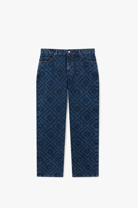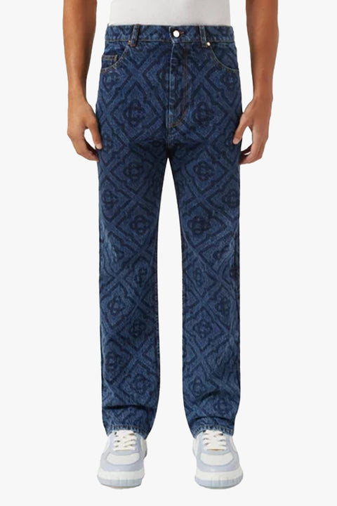 The dark vintage monogram jeans are a straight-leg design, crafted from the Casablanca signature monogram cotton fabric. Completed with zip closure, gold-plated branded hardware, belt loops, and front and back pockets and an Italian calf leather branded patch.