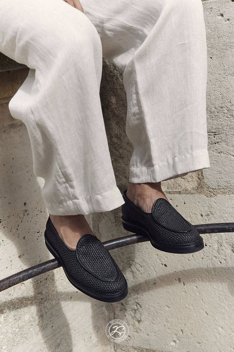 Introducing the quintessential summer loafers, now available in a sleek black version. This pair of LEX loafers is expertly woven from black raffia, boasting a cool profile and equipped with comfortable double-welted lightweight micro soles.
