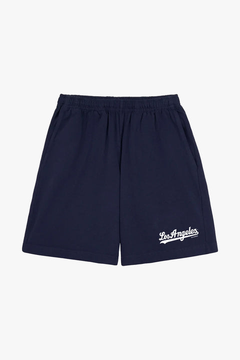 The Dodgers Gym Short is crafted from 100% cotton in a heavy jersey fabric for a soft yet durable feel. Designed with a mid-length cut, these shorts feature an elastic waistband with a drawstring for an adjustable fit, as well as front and back pockets for added functionality. Garment-dyed for a rich, lived-in look, they are proudly made in Los Angeles at a factory that ensures fair wages and benefits for its employees.