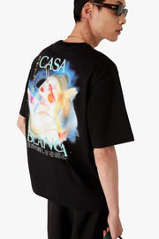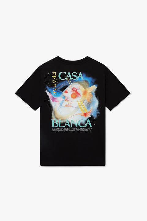 A cosmic statement piece, this oversized black tee is crafted from soft organic cotton and showcases Casablanca's seasonal airbrush artwork, inspired by Pater Sato. With a futuristic depiction of the brand's bionic beings set against mountainous landscapes, it’s finished with a classic crew neck for easy wear.