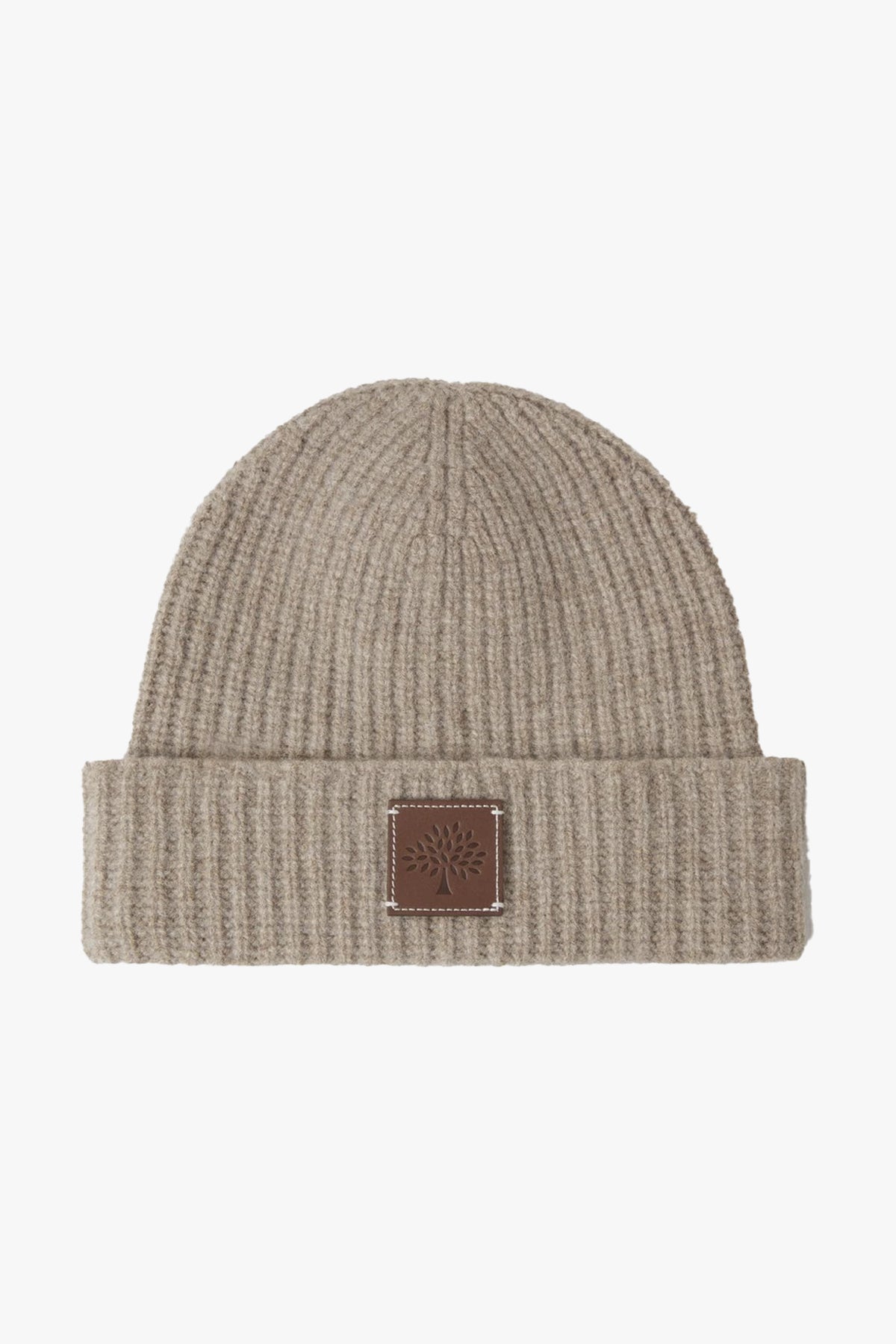 This 100% lambswool beanie features a Mulberry oak leather patch, and is the perfect way to keep warm in the winter months.