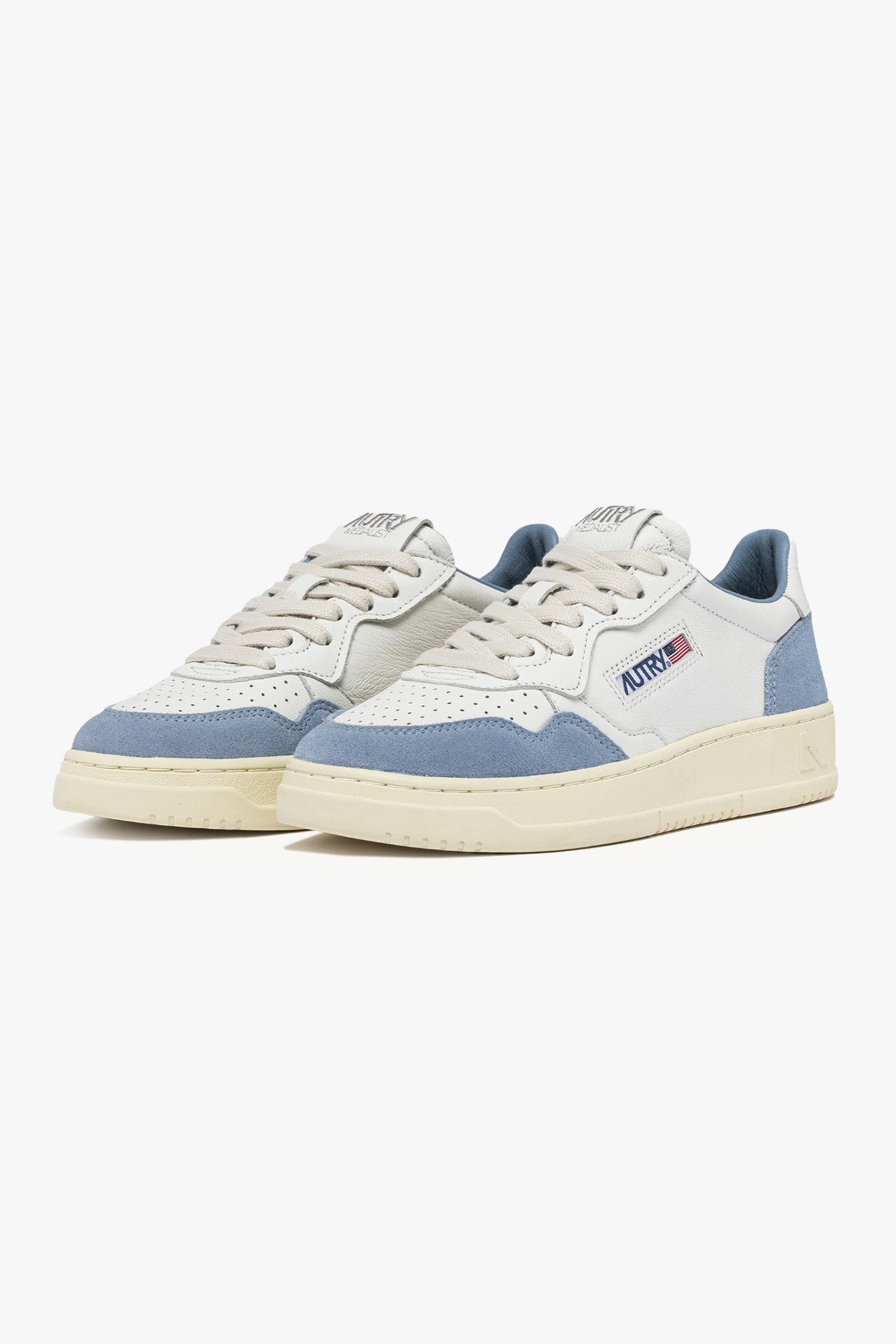 Autry Medalist heralds a new era of style and comfort. Featuring a low-top profile, this women's athletic shoe is crafted from white goatskin with light blue suede inserts and features a white heel tab defining the upper.