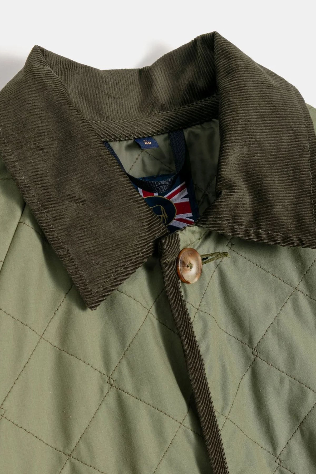 The Kirton Quilt Jacket from Lavenham is a lightweight cotton quilt jacket with a relaxed fit. Features raglan sleeves, contrast cord collar and button closure at front. Made from a robust dry wax cotton sourced from Halley Stevenson of Scotland, it is quilted in a diamond pattern. Featuring two large welt pockets.