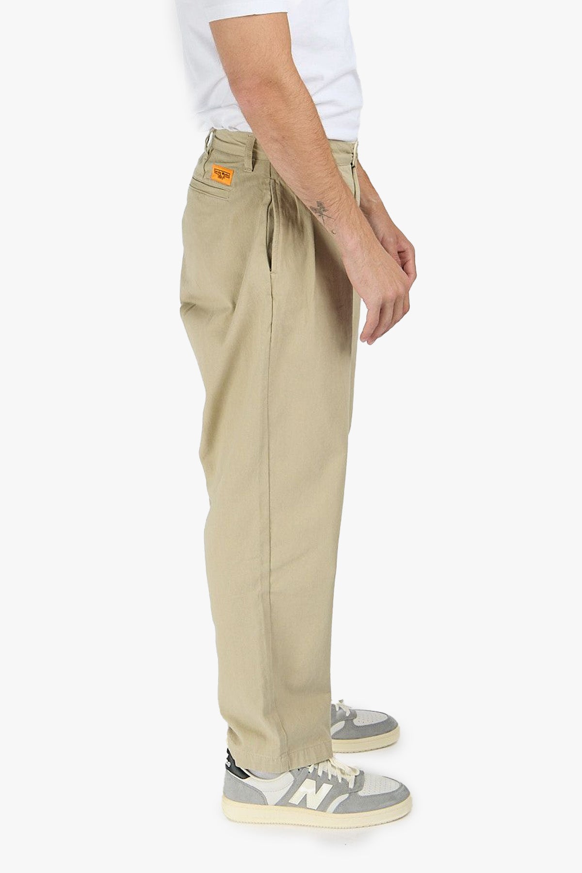 The Drill Part Timer Pant in khaki brings together relaxed utility and everyday comfort. With a baggy balloon fit and subtle taper, it's crafted from heavyweight GOTS-certified organic cotton drill and finished with garment dyeing for a soft, lived-in feel.