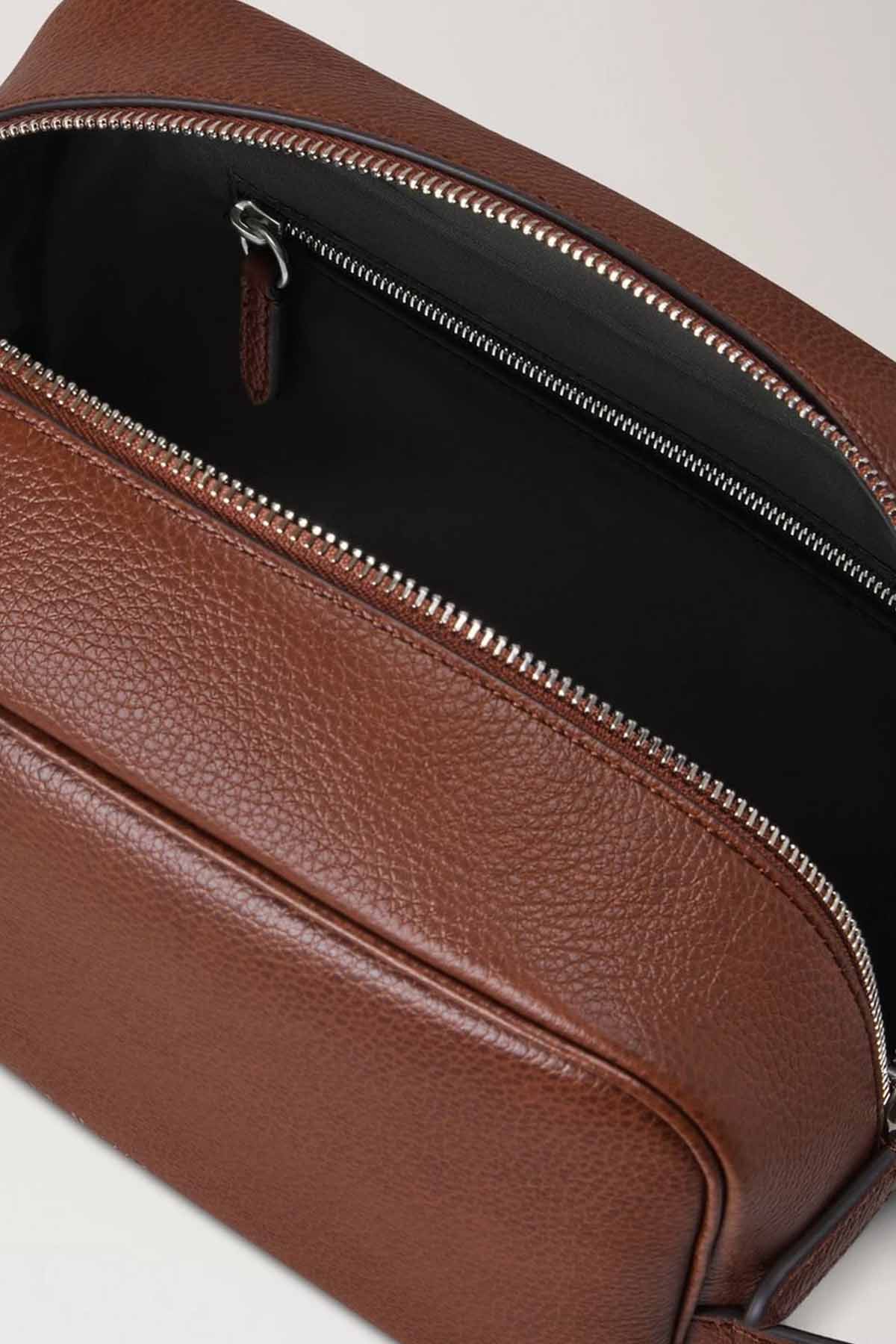 This classic wash case is the perfect companion to your travels. It features a convenient handle at one edge for easy toting. It is subtly embossed with the Mulberry signature logo at the side, nodding to a heritage of leather craft.