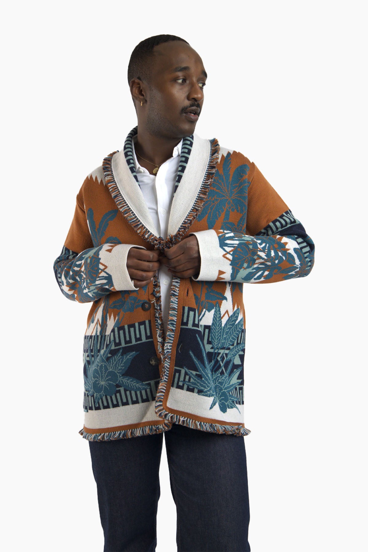 Island Soul Cardigan fra Alanui er et statement-plagg som kombinerer luksus, varme og kunstnerisk uttrykk. Strikket i 100% ull med merkets ikoniske jacquardteknikk, fremstår cardiganen som et bærbart kunstverk fylt med tropiske motiver og livlige farger. De karakteristiske frynsene og den myke konstruksjonen gir plagget et avslappet, men eksklusivt preg – perfekt til både hverdagsbruk og mer stilfulle anledninger.