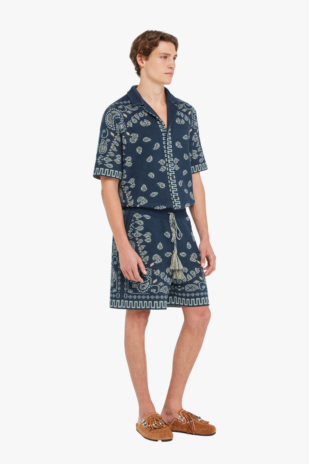 Cotton Piquet Bandana Bermuda er en sommerlig videreføring av Alanuis ikoniske bandanamønster, strikket i bomullspiké med dobbel jacquard-teknikk. Shortsen har en avslappet, luksuriøs følelse og er ferdigstilt med håndflettet snøring og dusker som gir et unikt, håndverksdrevet uttrykk. Perfekt alene – eller som et komplett statement-look sammen med den matchende Bandana Shirt.