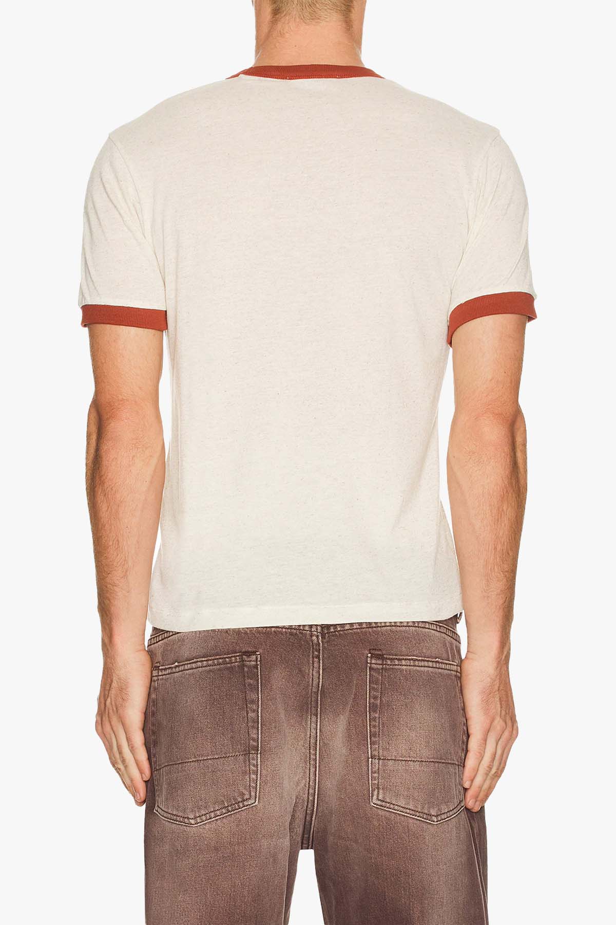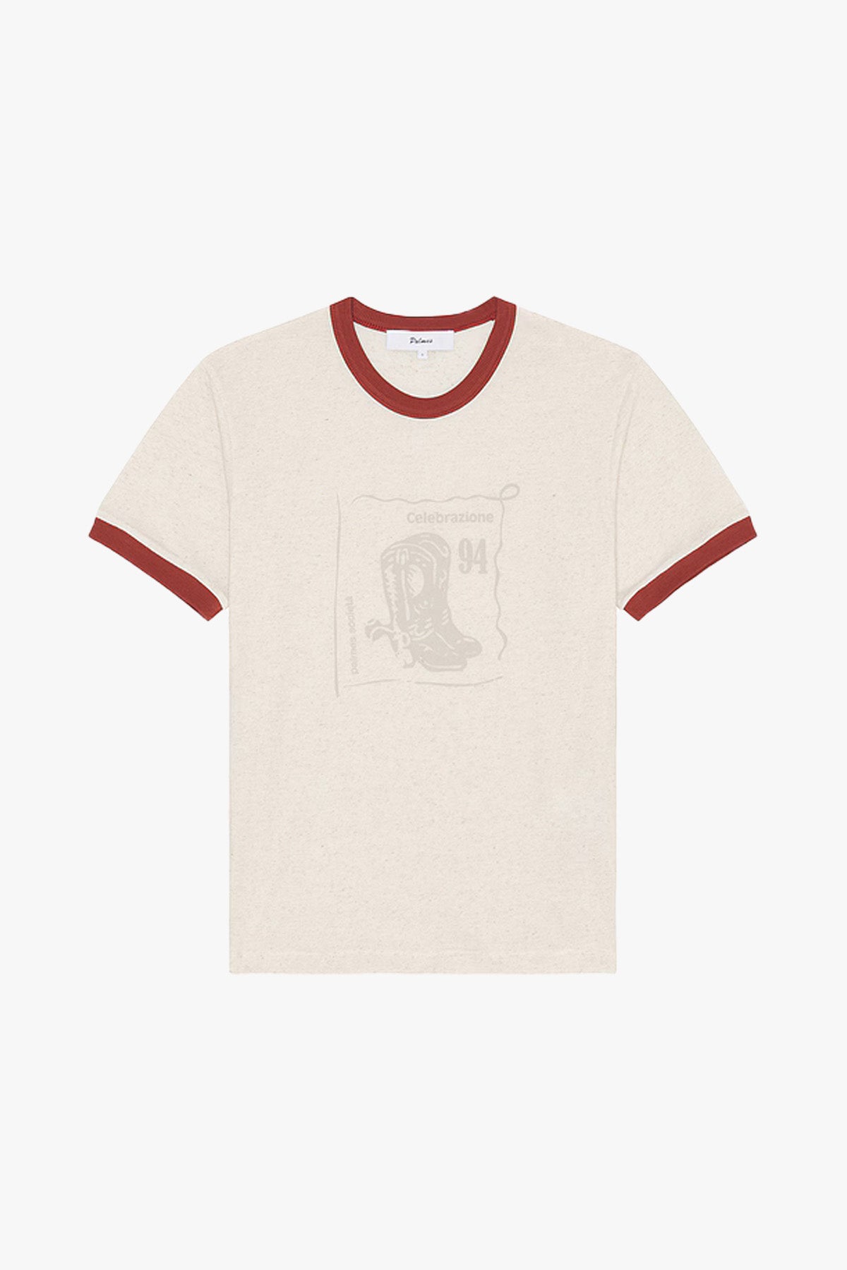 Celebrazione Ringer T Shirt er inspirert av klassisk vintage sportswear og har et avslappet, tidløst uttrykk. Den er laget i en taktil blanding av bomull og lin som gir en lett og behagelig følelse mot huden. Kontrastfarget ribb i hals og ermer fremhever ringer silhuetten, mens et screenprintet motiv i front tilfører karakter og et tydelig Palemes uttrykk. En hverdagsfavoritt som fungerer like godt alene som stylet under en overskjorte.