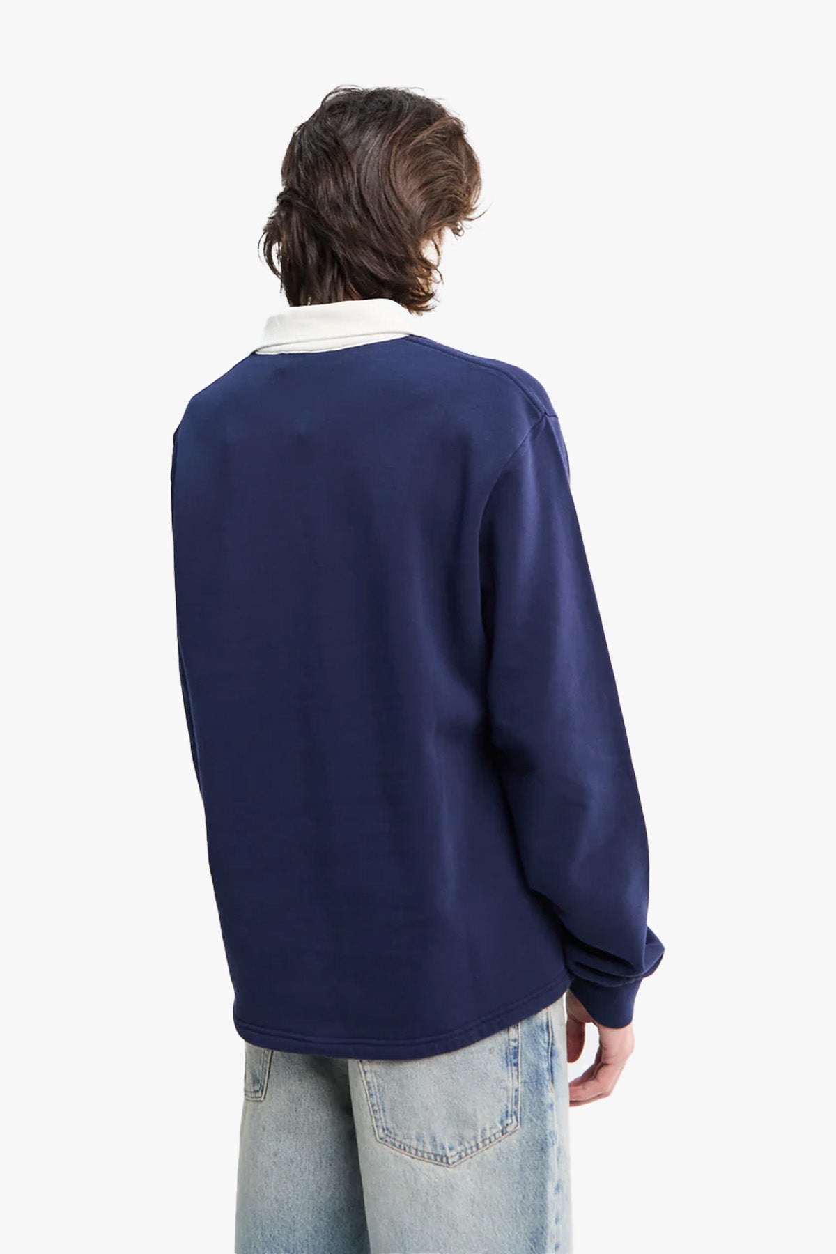 Subtil grafisk brodering tilfører et diskret statement og forsterker den klassiske rugbyestetikken. En uanstrengt modell med tydelig identitet.