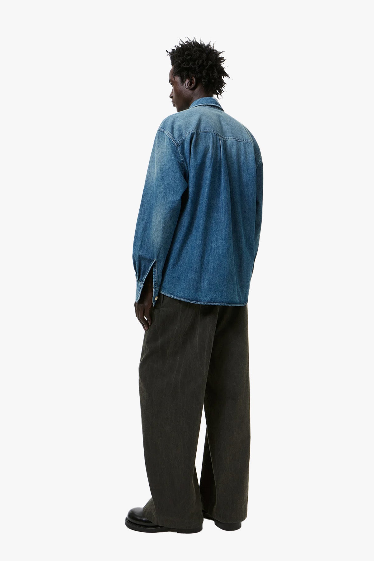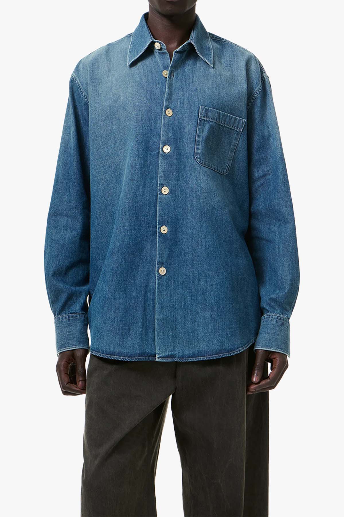 Above Shirt i Whatever Wash er laget i italiensk, økologisk bomull med en vintage denim-vask som gir et slitt, autentisk uttrykk. Hver skjorte får sin egen unike nyanse gjennom en behandlingsprosess som skaper subtile fargevariasjoner og et naturlig patinert preg. Modellen har en lett oversized passform og klassiske detaljer som brystlomme, perlemorsknapper, avrundet fald og miterte mansjetter.