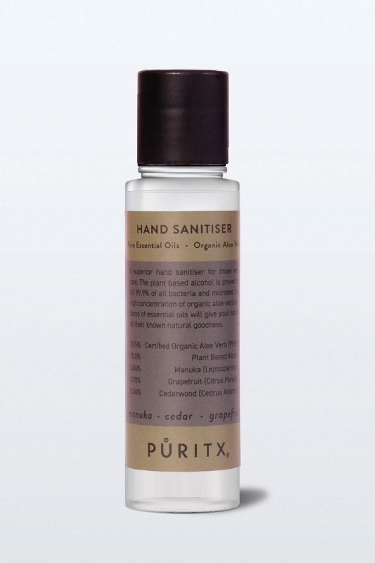 Contains: Ethanol*, Aloe Barbadensis Leaf Juice**, Aqua (Water)*, Citrus Paradisi Fruit Oil (Grapefruit)*, Leptospermum Leaf Oil (Manuka)*, Cedrus Atlantica Root Oil*, Carbomer, Triethanolamine, Citric Acid*, Citral, Geraniol, Limonene, Linalool