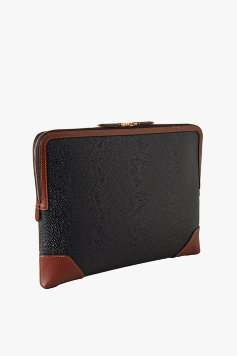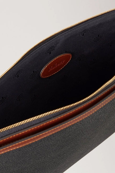 The Travel Tech Folio from Mulberry is a slim functional Travel Tech Folio that offers an elevated storage solution for your tech. A double zip opening makes stashing laptops away easy, while the external slip pocket's magnetic closure keeps things simple. Leather trim detailing and Mulberry Tree fabric lining add the finishing touches.