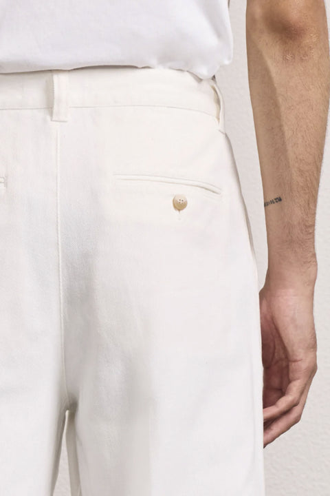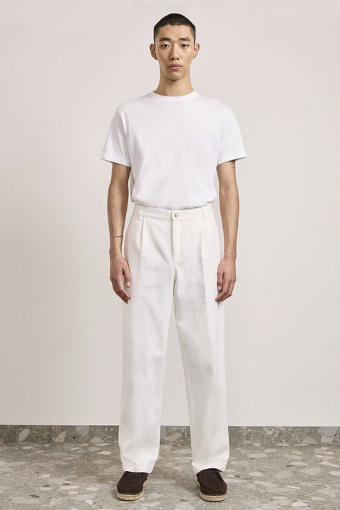Aldo is Frescobol's wide-leg pleated trouser. Woven from a raw cotton twill blend, the heavier-weight fabric holds the garment's relaxed shape while the permanent pleat offers a sartorial edge.