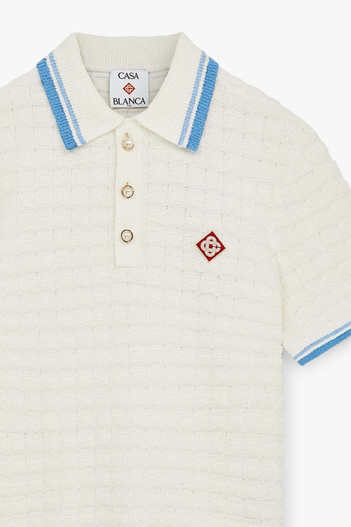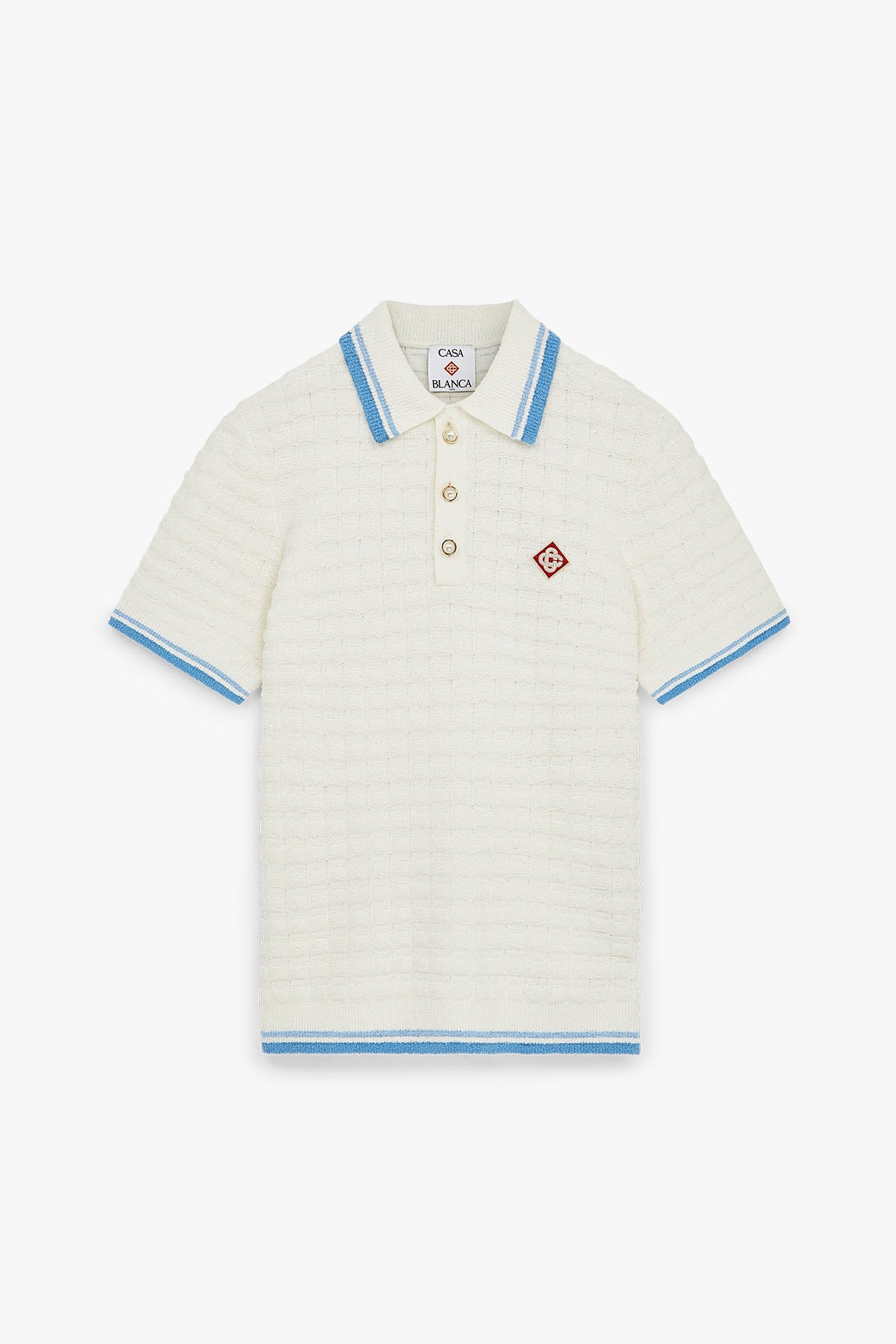A timeless silhouette reimagined in textured cotton bouclé. This short-sleeve polo blends classic elegance with signature Casablanca detailing, including the house’s iconic diamond logo and luxurious gold rim pearl buttons. A refined staple that balances sophistication and comfort.