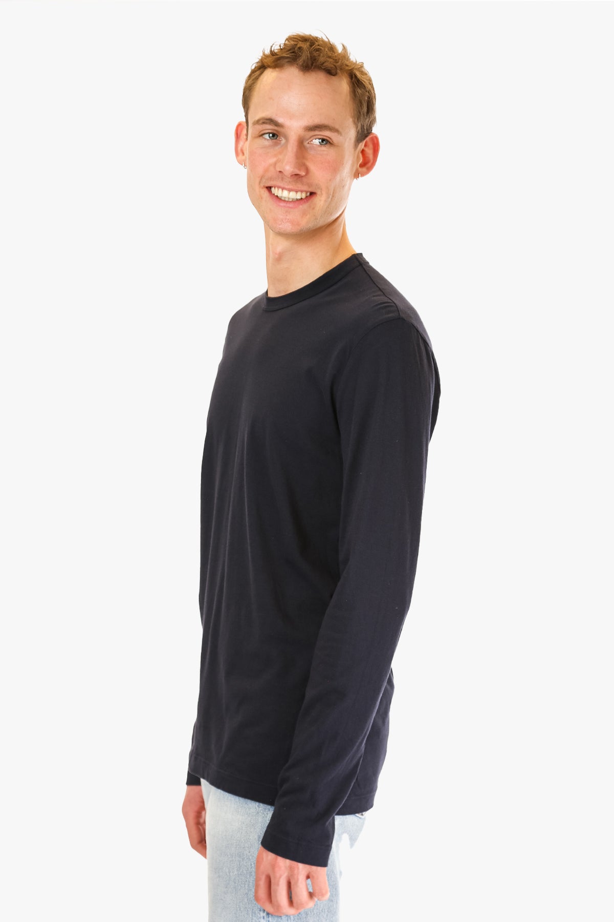 The Longsleeve T-shirt from James Perse is crafted of 100% cotton. The jersey is an exceedingly soft knit, made by treating the fibers of cotton before they are spun into yarn. The longsleeve T-shirt has full length sleeves, finished hems & a binded neck. The garment is dyed with extra softeners for an extra soft feel.