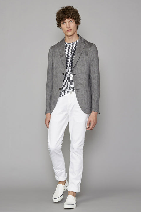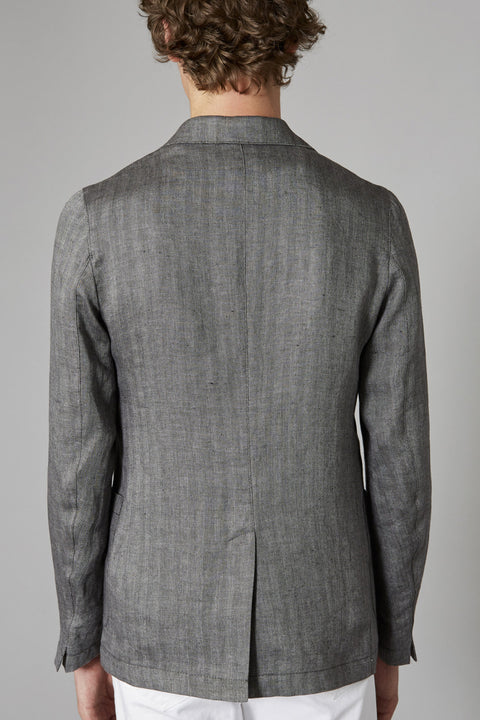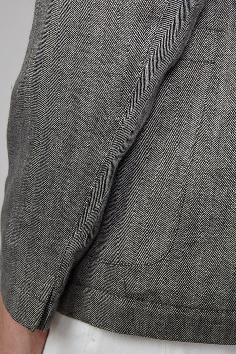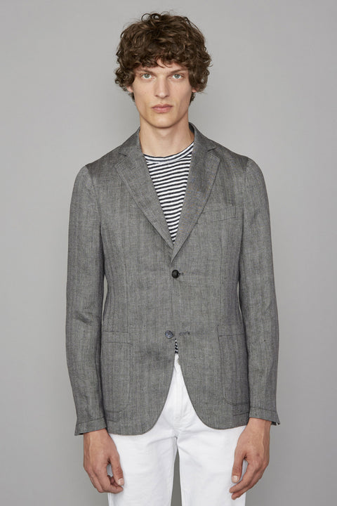 Unconstructed two buttons jacket, soft shoulder with no padding, unlined body. Sleeves lined with slits at bottom. Patch pockets. Single slit at center back. Italian linen in herringbone pattern.