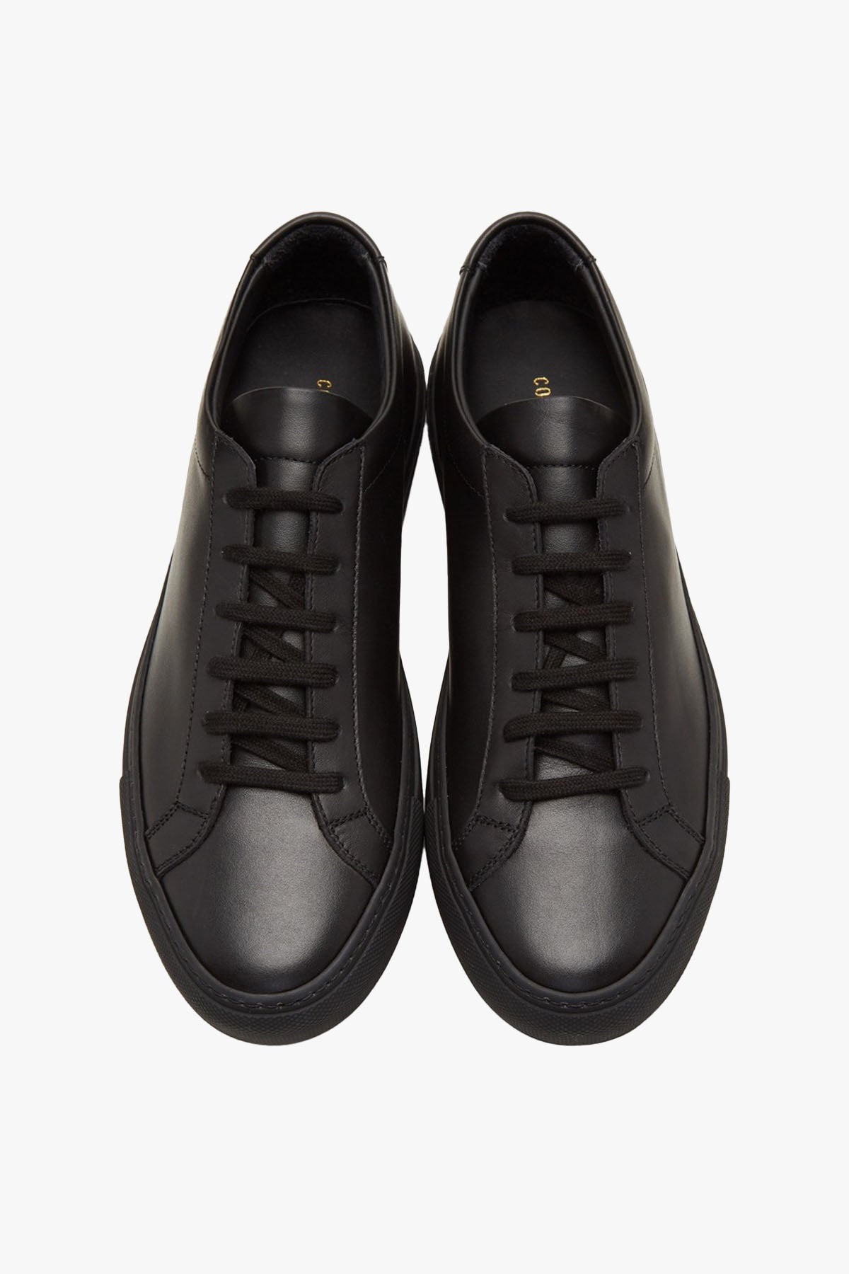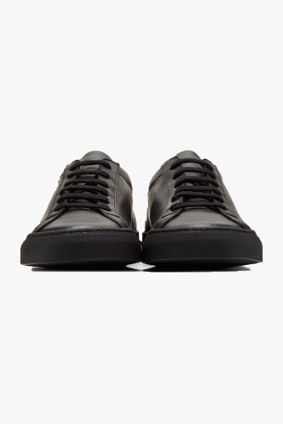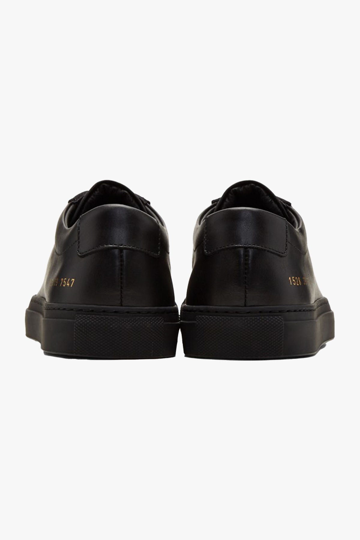 Low-top buffed leather sneakers in black. Round toe. Tonal lace-up closure. Padded tongue and collar. Series number stamp in gold-tone at outer side. Tonal rubber sole.